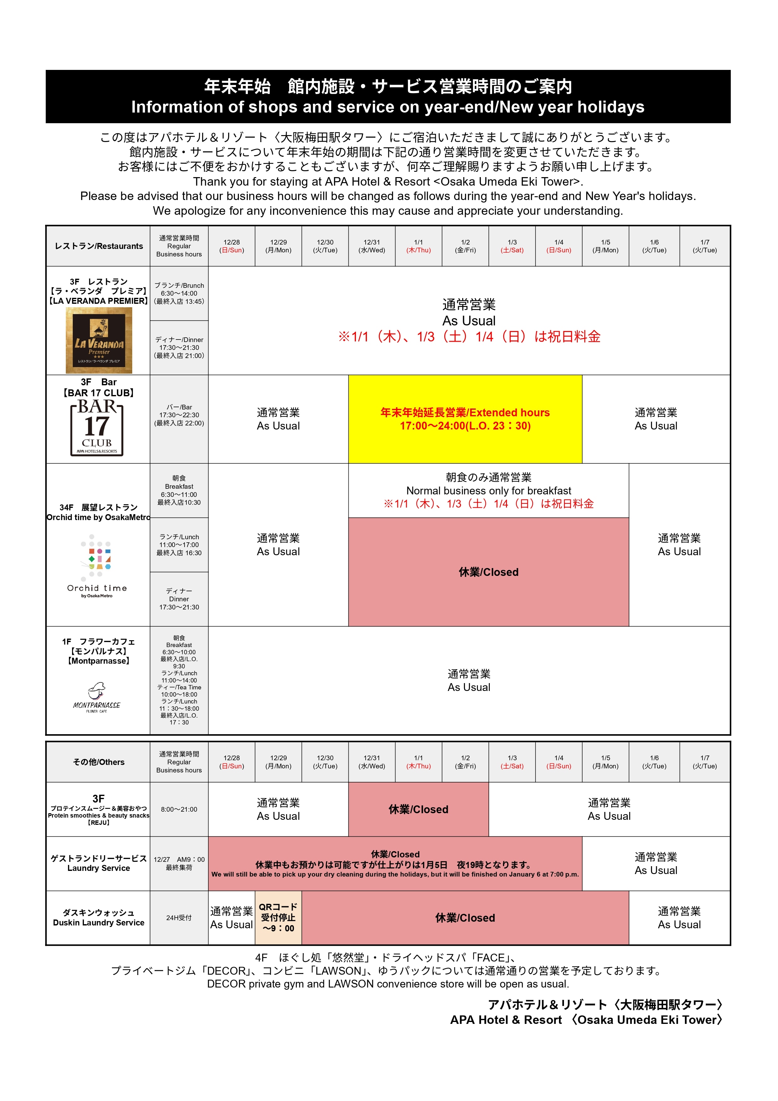 この度は、アパホテル&リゾート〈大阪梅田駅タワー〉にご宿泊いただき、誠にありがとうございます 。 2026年を迎えようとするこの特別な季節、皆様が館内で快適に、そして楽しくお過ごしいただけるよう、年末年始の営業スケジュールをご案内いたします。