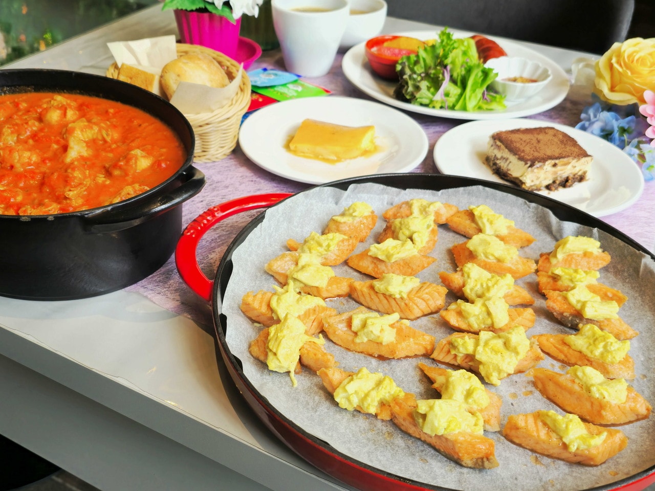 自家製クレームブリュレ、自家製ティラミス、スープ、オレンジジュース・フルーツ・コーヒー・紅茶