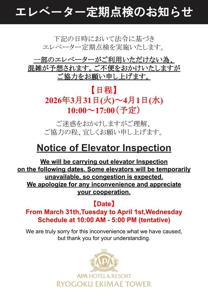 【2026年3月31日~4月1日】エレベーター定期点検実施のお知らせ