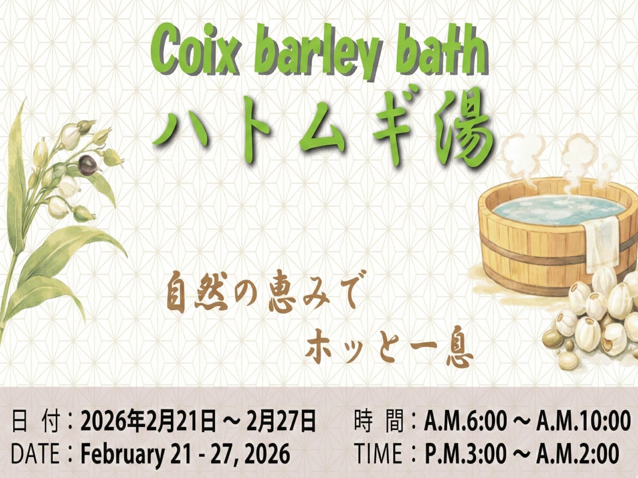 当館では、お客様に旅の疲れや日頃のストレスを癒やしていただくため、期間限定で「ハトムギ湯」を実施いたします。