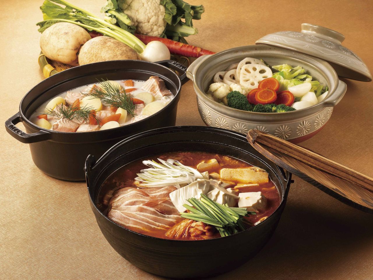 1月は【温ったか鍋・煮込みフェア】・プレミアムポークと自家製豆腐のキムチ鍋・国産牛シチューのパイ包み焼き・冬野菜のヴィーガンポトフ・ディル香るサーモンとポテトのロヒケイット を提供いたします。